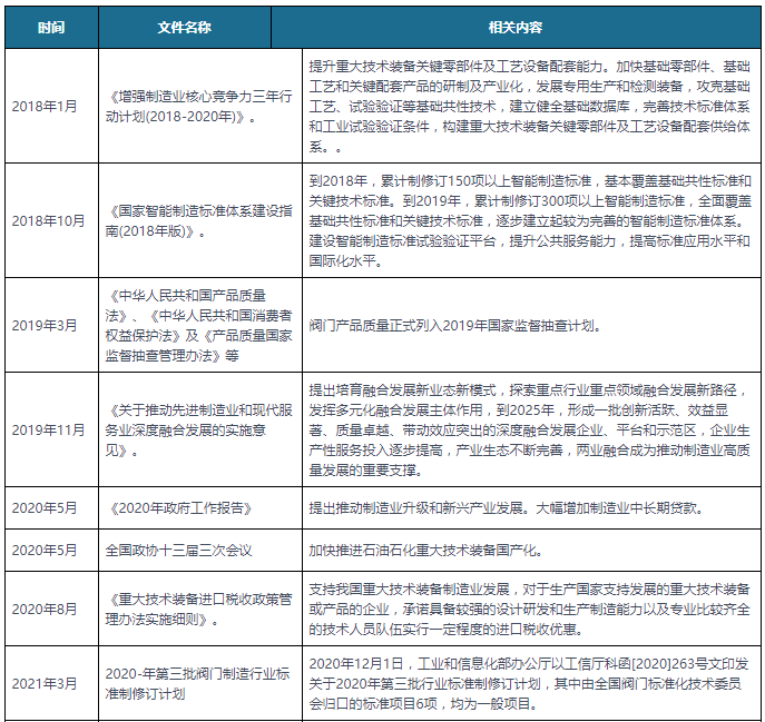 据观研报告网发布的《中国阀门行业发展趋势分析与投资前景预测报告(2022-2029年)》显示,近些年,为加强阀门规范管理,我国各部门纷纷出台了一系列政策,如2022年1月出台的《关于加强公共供水管网漏损控制的通知》,提到在管线建设改造、设备安装及分区计量系统建设中,积极推广采用先进的流量计量设备、阀门、水压水质监测设备和数据采集与传输装置,逐步实现供水管网网格化、精细化管理。